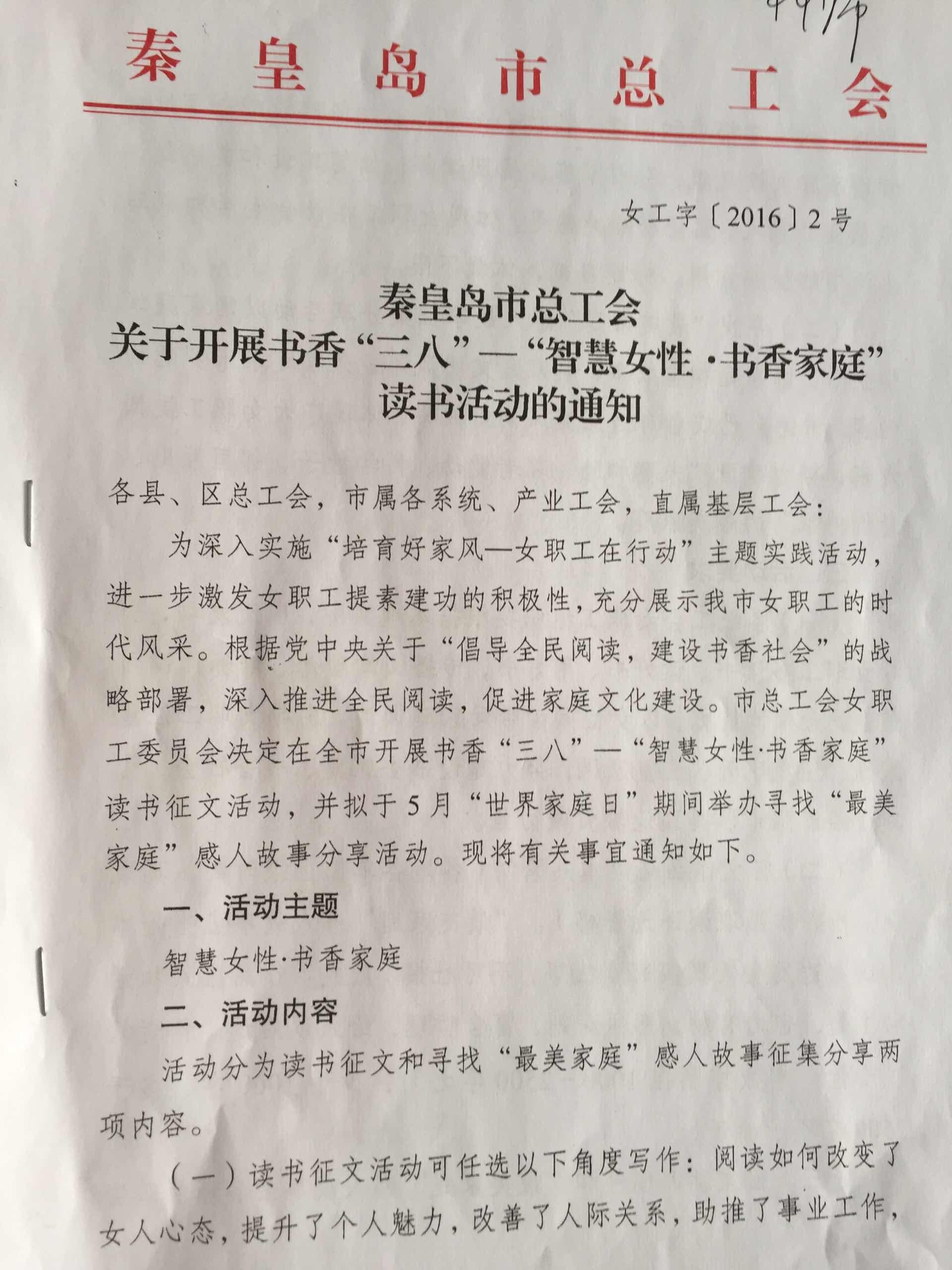 秦皇岛市总工会关于开展书香“三八”——“智慧女性.书香家庭”读书活动的通知