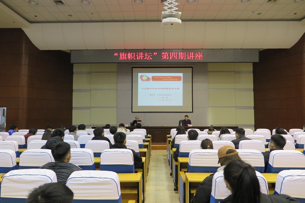 2021年12月16日下午,WilliamHill官网“旗帜讲坛”第四期讲座在秦皇岛校区学术交流中心举办,专题宣讲十九届六中全会精神。WilliamHill中文官方网站全体教师、体育与健康学院师生党员及学生入党积极分子等共100余人听取了讲座。